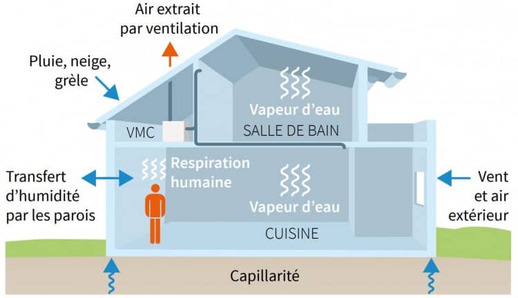 La condensation est un facteur important d'humidité pour les murs intérieurs : un renouvellement d'air insuffisant favorise le dépôt de l'humidité sur les parois, surtout celles qui sont en contact avec l'extérieur (façade). L'installation d'un système de Ventilation Mécanique Contrôlée (VMC) simple ou double flux permet au flux d'air de circuler et d'assécher l'atmosphère, la rendant plus saine. C'est le complément indispensable à vos travaux d'isolation !