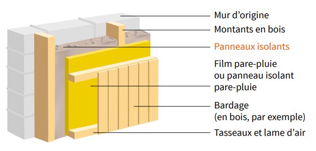 L'isolant est posé entre les montants d'une armature fixée à la façade. Le tout est recouvert d'une membrane pare-pluie pour assurer l'étanchéité. Enfin, le bardage extérieur décoratif est fixé sur des tasseaux, en ménageant une lame d’air d'environ 2 cm entre l’isolant et le bardage.